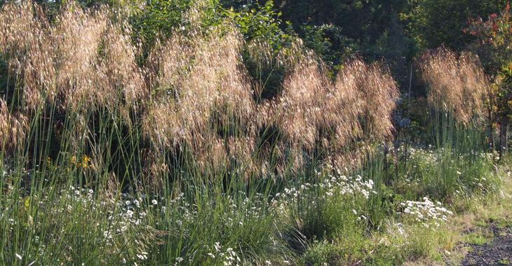Reuzen vedergras of straalhaver. Zeer lange bloemstengels en een prachtige luchtige bloei. Kan ook voorin de border worden geplant, staat het liefst op een schrale plek.